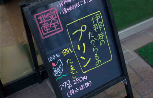 「伊那谷のたからものプリン」は2種類。ごまプリンとたまごプリンだ。ごまプリンは、国内流通量の1%以下と言われる貴重な国産胡麻を、この伊那谷で無農薬で栽培している駒ヶ根市の企業から仕入れた。プリンを固めるのには、伊那で生産された寒天加工品を使った。甘みには、やはり地元のはちみつを用いた。