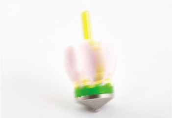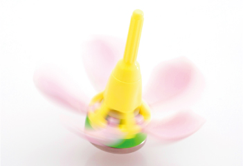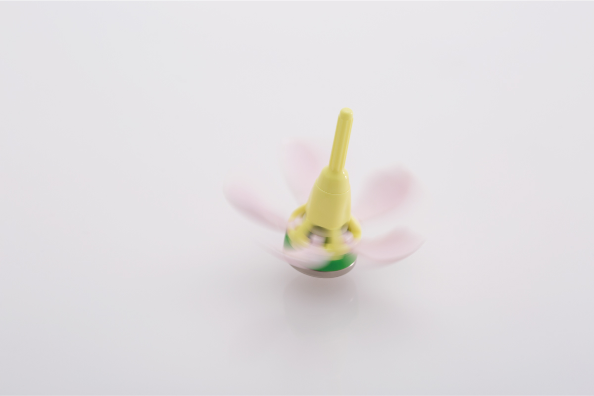 絶妙なテンションに設定したバネをコマ内部に組み込むことで、回転が遅くなるにつれ、開いていた花がゆっくり閉じていく動きを実現しました。
