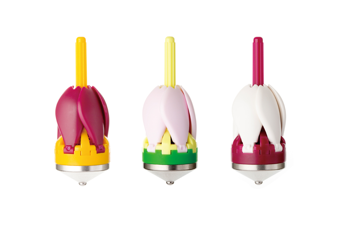 回すと花開くというギミックで、全日本製造業コマ大戦でも話題をさらったコマ。量産化に伴い、さらに開花の美しさと回りやすさを追求しました。