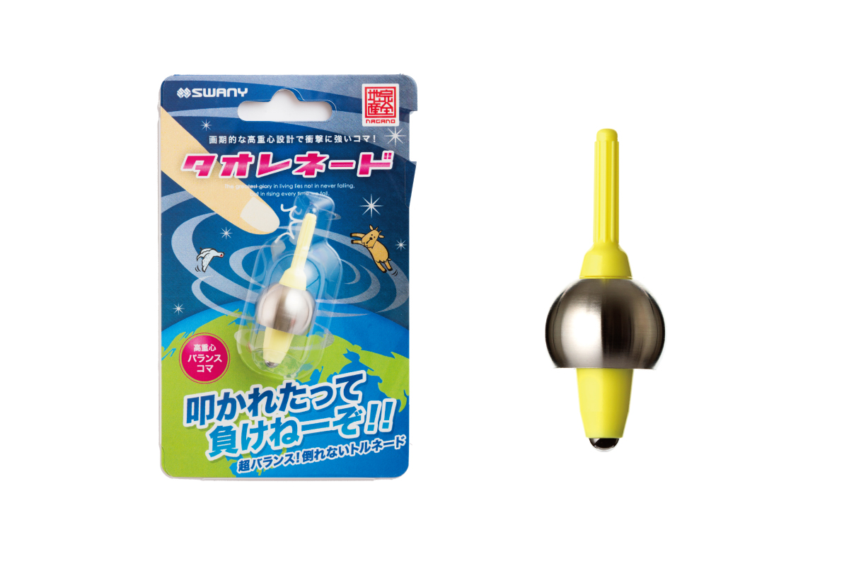 どんなに叩かれてもなかなか転ばないバランスのよさ、竜巻の如く回り続ける勢いのよさから、「タオレネード」と名付けました。われわれ製造業ご当地お土産プロジェクトも同様に回り続けたいと、「とことこイーナちゃん」から間髪置かず世に出しました。